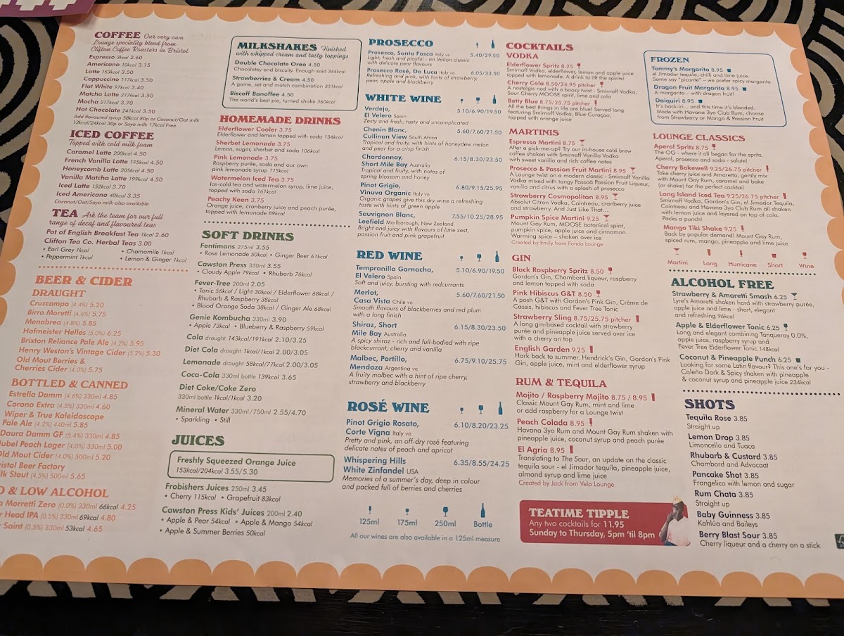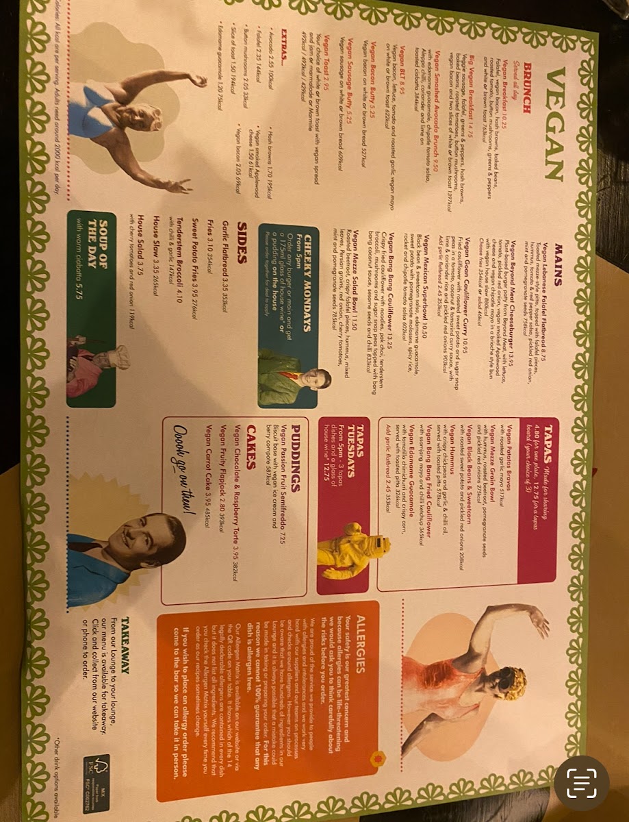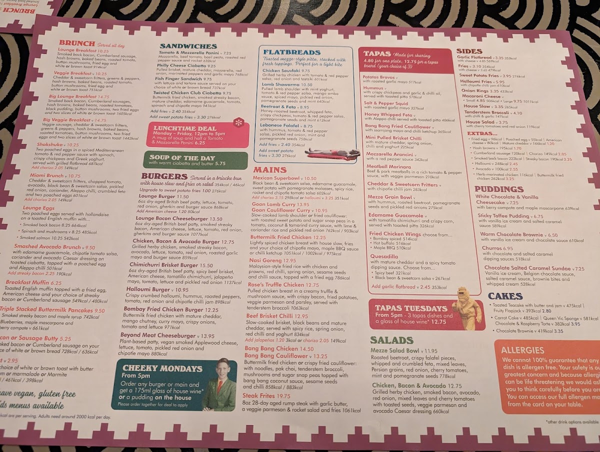 Consurio Lounge offers a diverse and vibrant menu catering to various dietary preferences, from brunch to mains, sides, and indulgent puddings. For breakfast, you can enjoy options like the Lounge Breakfast and Big Lounge Breakfast, with a choice of classics like the Breakfast Muffin with Streaky Bacon. Sandwich lovers can savor a range of toasties, including the Grilled Cheese Toastie and Brisket Birria Toastie. For burger enthusiasts, there's a selection of hearty burgers such as the Lounge Burger and Bacon Cheese Smash Burger. Mains like Dan Dan Noodles with Chinese Pork Belly and Birria Tacos with Spicy Brisket provide a satisfying experience, while the Tapas Board Deal offers an exciting variety of tapas. Sides include delicious options like Lounge Triple Cheese Fries and Sweet Potato Fries, perfect for sharing or complementing your meal. For dessert, enjoy decadent treats like the Berry Cheesecake or Warm Chocolate Brownie. The restaurant caters to gluten-free and vegan diets with dedicated menus, offering dishes like the Vegan Sri Lankan Curry and GF Chocolate & Raspberry Torte. Drinks are equally diverse, with options from Bubble Tea to crafted Cocktails like the Amaretto Sour and refreshing Elderflower Cooler. Whether you're looking for a filling meal or just a light bite, Consurio Lounge’s menu has something for everyone, ensuring a delightful dining experience.